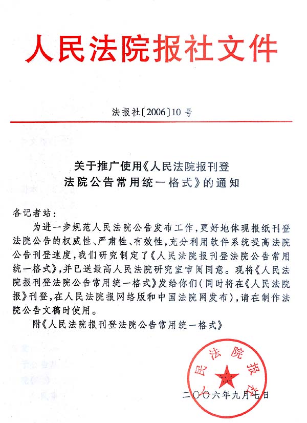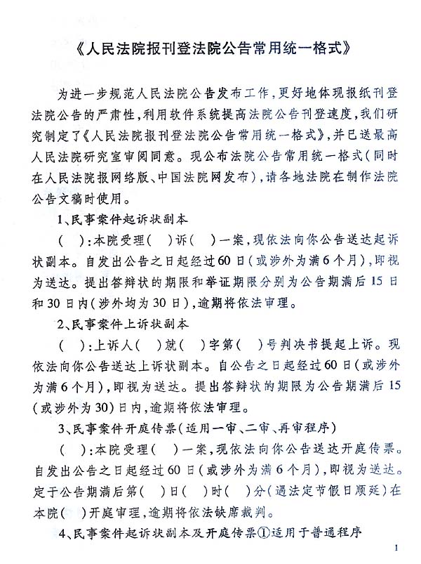 关于推广使用《人民法院报刊登法院公告常用统一格式》的通知