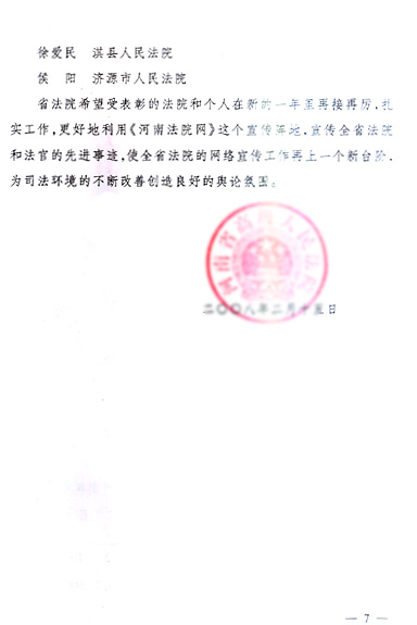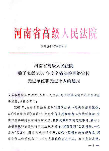河南省高级人民法院关于表彰2007年度全省法院网络宣传先进单位和先进个人的通报