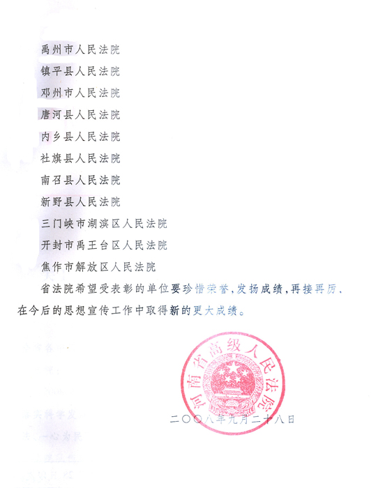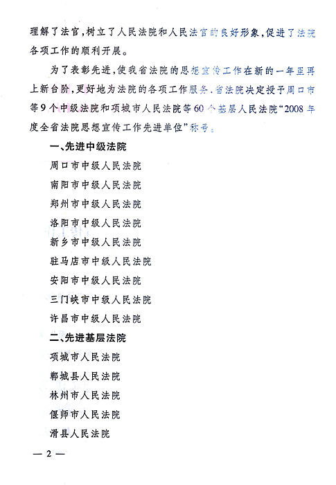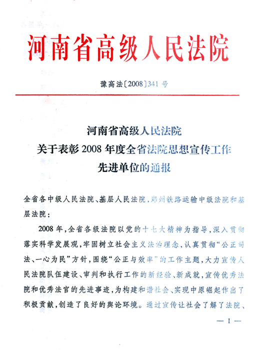 河南省高级人民法院关于表彰2008年度全省法院思想宣传工作先进单位的通报