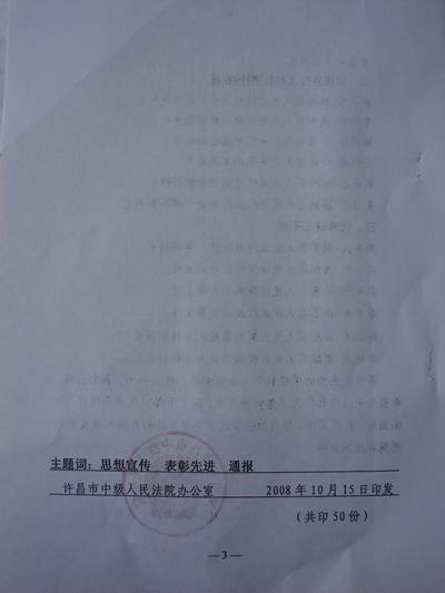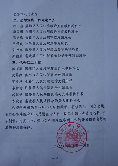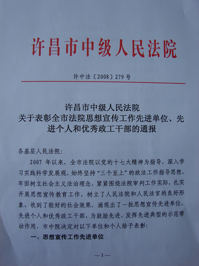 许昌市中级人民法院关于表彰全市法院思想宣传工作先进单位、先进个人和优秀政工干部的通报