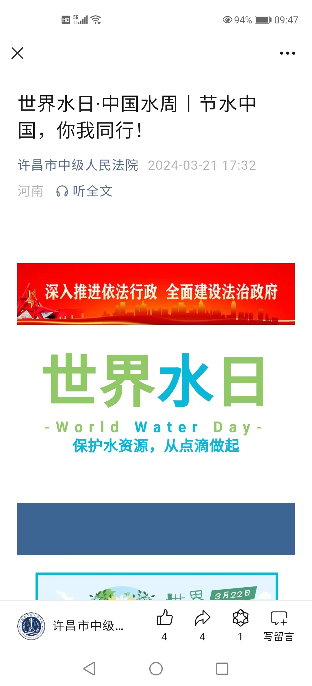 2024年3月22日是第三十二届“世界水日”,3月22日-28日是第三十七届“中国水周”。为贯彻落实习近平总书记生态文明思想,深入践行“绿色”发展理念,不断增强干警节水意识,许昌中院在宣传周活动中,以“精打细算用好水资源,从严从细管好水资源”为主题,开展了节水宣传活动。