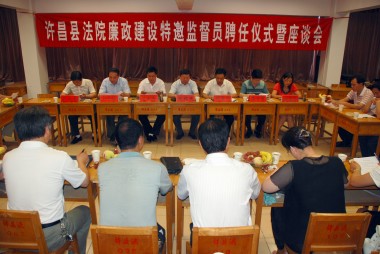 为进一步深入贯彻落实最高院“五个严禁”的规定,推进法院队伍建设,促进法院审判工作的公正、廉洁、高效,自觉接受社会各界对法院工作的监督,6月24日,许昌县法院召开了特邀廉政监督员聘任仪式暨座谈会。会议特邀聘请了18名来自不同岗位、不同行业的廉政监督员,就法院审判工作和党风廉政建设进行座谈,征求他们对法院工作的建议和意见。