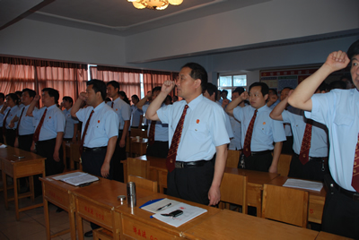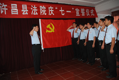 6月27日上午,许昌县法院召开党员大会,对发展成熟的4名新党员举行入党宣誓仪式,全院 名老党员和新党员一起,在党旗下庄严的举起右手,重温入党誓词,共同庆祝中国共产党建党87周年。